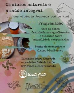 O encontro é um convite para nos conectar com os ciclos da natureza dentro e fora de nós, através de experiências sensoriais, momentos de aprofundamento e dinâmicas autênticas pela paisagem viva da Monte Cristo Agroflorestal.